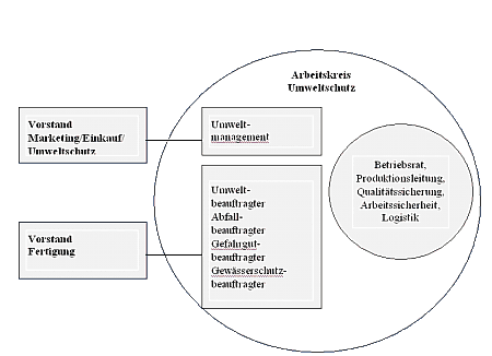 Die Organisationsstruktur zeigt, daß die 5 hauptsächlich mit Umweltfragen betrauten Mitarbeiter den Vorstandsbereichen Marketing und Produktion zugeordnet sind. Die der Produktion zugeordneten Mitarbeiter sind in erster Linie verantwortlich für die Einhaltung der für den Produktionsbetrieb relevanten gesetzlichen Vorschriften, wie z.B. Gefahrstoffverordnung, Wasserhaushaltsgesetz oder Landesabfallgesetz.