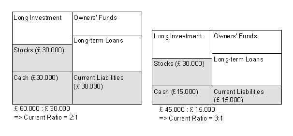 some current liabilities. For example, if the business's current assets total £ 60.000 (including £ 30.000 cash) and the current liabilities total £ 30.000, the current ratio is 2:1 . Using half the cash to pay off half the current debt just prior to the balance sheet date improves this ratio to 3:1 (£ 45.000 current assets to £ 15.000 current liabilities). If the business lacks the cash to reduce current debts, long-term borrowing to repay the short-term debt can also improve this ratio. For example, if the current assets total £ 50.000 and the current liabilities total £ 40.000, the poor 5:4 current ratio changes to a better 2:1 ratio if £ 15.000 of long-term debt is used to refinance an equal amount of short-term debt (£ 50.000 current assets to £ 25.000 current liabilities).