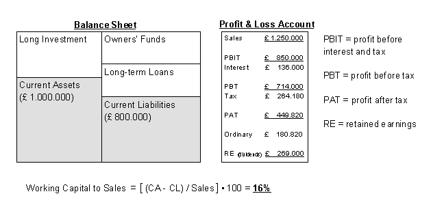 The term working capital is usually taken to mean the net current assets less the current liabilities. The working capital ratio expresses this value as a percentage of sales. The advantage of using this method is that the working capital ratio does not only take balance sheet data into account but also includes the value of the ongoing operations by including a value from the profit and loss account.