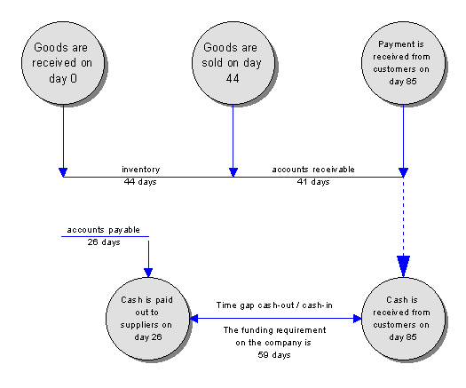 The company does not have to pay these stocks before day "26". Thus, they receive a credit of 26 days. But as the company does not collect its claims before day "85" there is a time gap of (85 minus 26) 59 days in which the need for working capital arises.