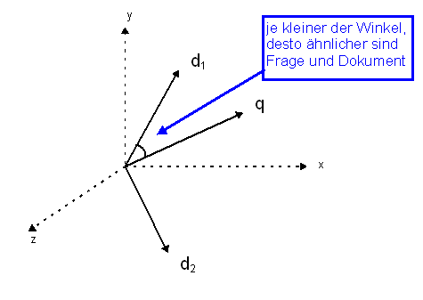 Das VRM ist ein anschauliches Modell zur Beschreibung der Ähnlichkeit von der Frage in Bezug auf das Dokument, da beide in einem Vektorraum abgebildet werden. In der Abbildung 12 ist dieses Prinzip graphisch für eine dreidimensionale Dokumentenbeschreibung, d. h. es existieren nur 3 Terme bei der Indexierung, aufbereitet. Die Dreidimensionalität wurde nur für die graphische Darstellung gewählt. Grundsätzlich können mit dem VRM n-dimensionale Dokumentbeschreibungen ausgewertet werden.