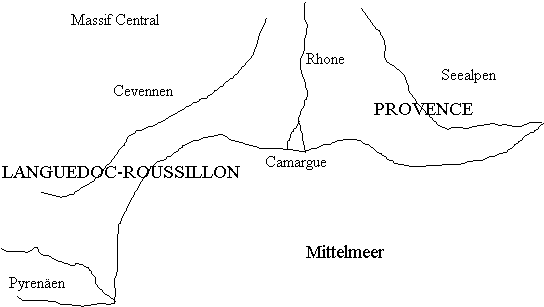 Der Languedoc erscheint im Gegensatz zum gebirgigen Massif der Provence als ein Amphitheater, das zum Meer hin geöffnet ist.[1] Eine Dreiteilung in Küstenebene mit zahlreichen étangs (Teichen), zwischen Küste und Gebirge liegender Hügelzone und in das Gebirge selbst mit einem in West-Ost-Richtung nach Aquitanien verlaufendem Korridor bietet sich an.