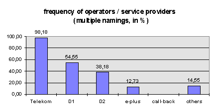 • 98% of the companies have Deutsche Telekom as operator for the terrestrial network, 55% have D1 cellulars, 38% D2, 13% e-plus. No company uses call-back services.