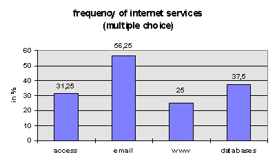 • Of the 32% - share using internet services, 31% have only passive access, 56% additionally use email, 25% have own webpages and 38% use databases which are not free.