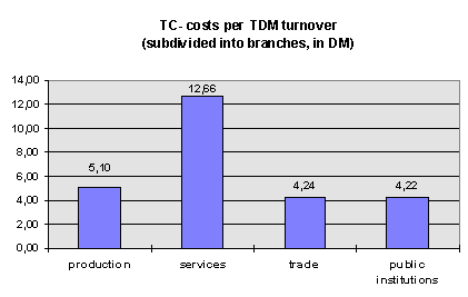 • The services sector has the highest TC-costs per TDM turnover with DM 12,7, production has costs of DM 5,10. Trade and the public sector have the lowest costs of approx. DM 4,20 per TDM turnover each.