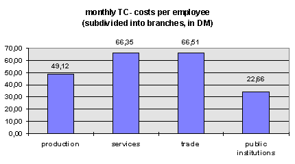 • The monthly TC-costs per employee differ extremely. Trade and services reach a level of DM 66,5 and 66,4 resp., the production sector has costs of DM 49,1 per employee. The public sector has relatively low costs of DM 22,7 only.