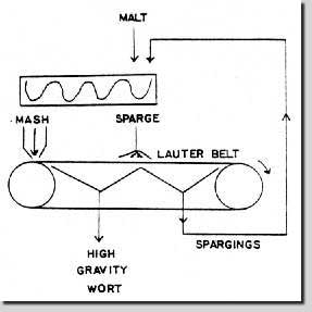 Nach Schaus lassen sich keine zufriedenstellenden Sudhausausbeuten erzielen, wenn man bei höherer Schüttung nach den herkömmlichen Methoden maischt und läutert. Dies lies sich jedoch ändern, indem man einen Teil eines 12%igen Sudes zum Einmaischen eines neuen Sudes benutze. Nach dem Abläutern dieses entstandenen 24% Sudes wurden die Nachgüsse wiederum zum Einmaischen des nächsten Sudes verwendet. Führt man diese System kontinuierlich weiter, wird das gesamte Brauwasser als Überschwänzwasser dem Brauprozeß zugeführt und die gesammelten Nachgüsse werden anstatt Maischwasser zum Einmaischen verwendet. Mit dieser Technik lassen sich dann zufriedenstellende Sudhausausbeuten erzielen (1). Die Abb. 1 illustriert die eben beschriebene Technik der fortlaufenden Verwendung der Nachgüsse: