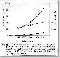 Die Esterbildung ist mit dem Hefewachstum verknüpft: Wird das Hefewachstum eingeschränkt, steigt die Esterproduktion. Aus dem Fettstoffwechsel der Hefe läßt sich dieser Zusammenhang erklären. Die Hefe verbraucht während der Wachstumsphase Acetyl – CoA für die Fettsäuresynthese, die aber nur stattfindet, wenn molekularer Sauerstoff vorhanden ist. Folglich ist die Sauerstoffkonzentration entscheidend für die Hefevermehrung, und, wenn kein Sauerstoff vorhanden ist, neigt die Hefe zur Produktion anderer Verbindungen wie z.B. der Ester (Abb.3) (14).