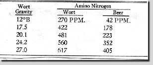 Versuche von Schaus zeigten, daß die Quantität der während der Gärung verbrauchten Aminosäuren bei den High Gravity Würzen genauso hoch war wie bei normalen Würzen (Tab.7). Da der Anfangsgehalt an Aminosäuren aber bei stärkeren Würzen höher liegt, bleibt ein Überschuß an Aminosäuren nach der Gärung im Bier. Man kann also bei der High Gravity Technik mehr Rohfrucht, die prinzipiell weniger Stickstoffsubstanzen liefert, einsetzen kann, und dies wird auch von der Hefe verkraftet (1).