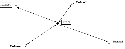 Diese Netzwerktopologie arbeitet im sogenannten Polling-Verfahren, d.h. daß jeder angeschlossene Rechner vom Host (Zentralstation) reihum abgefragt wird, ob er senden möchte oder eben nicht. Genutzt wird dabei der (schnelle) Prozessor des Hosts. Der Aufbau dieses Netzwerkes ist recht einfach und kostengünstig, hat allerdings auch entscheidende Nachteile: Fällt eine Leitung aus, ist der betroffene Rechner vom Netzwerk getrennt. Fällt gar der Host aus, hat das gesamte Netzwerk ausgedient.