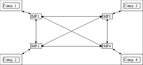 Abb.2: Datenaustausch zwischen den Hostrechnern/IMPīs sowie IMPīs/IMPīs (vereinfachte Darstellung)