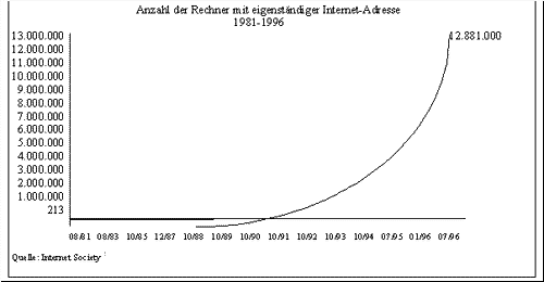 Mit welch enormer Geschwindigkeit die Anzahl der eigenständigen Rechner im Internet seit der Einführung des WWW-Dienstes im Jahr 1992 zunahm, soll nachfolgende Graphik verdeutlichen: