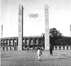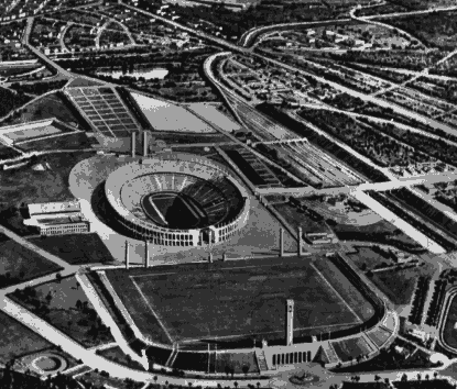 Nach der Vergabe der Olympischen Spiele an Berlin 1936,stellte sich die Frage nach einem standesgemäßen Rahmen zur Durchführung der Spiele. Hierzu war vor allen Dingen ein großzügiges Stadion mit vielen Zuschauerplätzen von Nöten. Dabei dachte man zunächst daran, das 1913 von Otto March errichtete Grunewaldstadion zu benutzen, das eigentlich für die Olympischen Spiele 1916 vorgesehen war, die aber wegen des 1.Weltkrieges nicht stattfinden konnten. Doch nachdem alle Modernisierungsvorschläge in Betracht gezogen worden waren, kam man zu dem Entschluß, daß das Grunewaldstadion kein würdiger Rahmen zur Präsentation des "Neuen Deutschlands" vor der Welt sei. Als Adolf Hitler im Oktober 1933 die Pläne und das Gelände besichtigte, forderte er ein neues Stadion von einzigartiger Weite, Übersichtlichkeit und Landschaftsverbundenheit, und erteilte dem Architekten Werner March den Auftrag für die Erstellung des Reichssportfeldes. Im April'34 begannen dann die Bauarbeiten für das Reichssportfeld unter der Leitung von Werner und Walter March. Das Bauprogramm des Reichssportfeldes umfaßt folgende Einrichtungen: