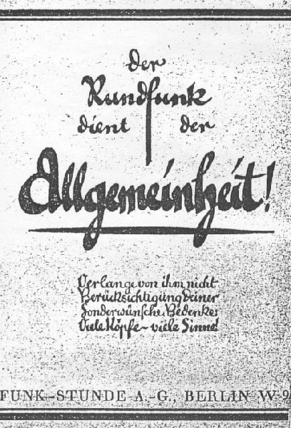 Am 29. Oktober 1923 wurde in Deutschland der Rundfunk als Massenmedium eröffnet. Die Berliner Funkstunde startete mit dem "Radio für alle" und erhielt eine doppelte Zielsetzung: Zum einen sollte es den Arbeitern und Arbeiterinnen Zerstreuung und Unterhaltung bieten, zum anderen der Industrie neue Absatzmöglichkeiten in Form von Rundfunkempfängern erschließen. Hans Bredow, Generaldirektor der Firma Telefunken, wurde erster Reichsrundfunkkommissar und ging in die Geschichte als "Vater des deutschen Rundfunks" ein. In seiner Eröffnungsrede zur Freigabe des neuen Mediums sagte er: "In einer Zeit schwerster wirtschaftlicher Not und politischer Bedrängnis wird der Rundfunk für die Allgemeinheit freigegeben." (Bredow 1956, zit in CD ROM 20er Jahre, SDR Schulfunk, 1994). "Das deutsche Volk ist wirtschaftlich verarmt, und es ist auch nicht zu bestreiten, daß auch die geistige Verarmung Fortschritte macht ... Erholung, Unterhaltung und Abwechslung lenken den Geist von den schweren Sorgen des Alltags ab, erfrischen und steigern die Arbeitsfreude: Aber ein freudloses Volk wird arbeitsunlustig. Hier setzt die Aufgabe des Rundfunks ein ... ,wenn gleichzeitig der Industrie ein neues Tätigkeitsfeld eröffnet ... wird, dann wirkt der Rundfunk aufbauend ..." (Bredow 1956, zit. in Faulstich, W., 1979, S. 193). In dieser Rede zeichnete Bredow einen ökonomischen und ideologischen Funktionszusammenhang des neuen Massenmediums Radio. Zum einen greift es indirekt in den Wirtschaftsprozeß ein: Durch "Erholung, Unterhaltung und Abwechslung" sollen die arbeitenden Menschen dem Produktionsprozeß wieder zugänglich gemacht werden. Zum anderen wird der Kommunikationsindustrie ein neuer Absatzmarkt geschaffen. (vgl. Faulstich, W., 1979, S. 193, 194).
