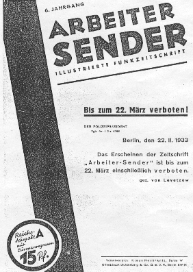 Am 26. Februar 1933 wird der KPD-nahe "Freie Radio Bund Deutschlands" gewaltsam aufgelöst und deren Mitglieder in die Illegalität getrieben. Der sozialdemokratische "Arbeiter Radio Bund Deutschland" kann sich nur wenige Monate länger halten und wird im Zuge des SPD-Verbots im Juli 1933 zerschlagen. (vgl. Grieger, K., 1995)