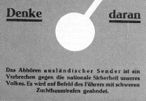 Nicht nur Sender des organisierten Widerstands in Deutschland setzten den gleichgeschalteten Medien ihre Informationen entgegen. Bereits im September 1938 hatte die BBC in London begonnen, deutschsprachige Sendungen ins Deutsche Reich auszustrahlen: Die ersten Takte der 5. Symphonie Beethovens, gefolgt von dem Morsezeichen "V" für Victory, geschlagen auf einer Pauke, dies war das Erkennungszeichen für alle, die sich nicht ausschließlich über die gleichgeschalteten deutschen Medien informieren wollten. (S. Tondokument 5: Erkennungsmelodie des deutschsprachigen Dienstes der BBC). Wer selbst beim abhören von Auslandssendern belauscht wurde, sei es von Nachbarn, oder dem örtlichen Gestapospitzel, der mußte mit hohen Zuchthausstrafen rechnen. Nicht wenige bezahlten bei Weitergabe von Meldungen, die sie den "Feindsendern" entnommen hatten, mit ihrem Leben. (vgl. Sarkowicz, H., 1990, S. 7). Um die "Volksgenossen" eindringlich auf das Abhörverbot ausländischer Rundfunksender hinzuweisen, verteilten 1941 alle NSDAP-Ortsgruppen Zettel, die an die Senderabstimmknöpfe der Rundfunkempfänger angebracht werden mußten.