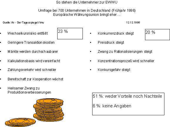 In Tabelle 2 sehen wir das Ergebnis einer Umfrage vom Frühjahr 1996 bei 700 deutschen Unternehmen. Ungefähr 23 % der Unternehmen sehen Vorteile in der Durchführung einer europäischen Währungsunion.