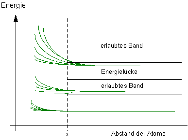 In den Halbleiter beträgt der elektrische Widerstand zwischen 10-3 und 10+3 W cm. Werden den Halbleitern jedoch gewisse Unreinheiten hinzugefügt, können sie elektrisch leitend werden. In einem einzelnen Atom können die Elektronen nur auf bestimmten diskreten Energieniveaus existieren. Aufgrund des Pauli-Prinzips ist die Zahl der Elektronen, die auf einem bestimmten Energieniveau existieren können, zahlenmäßig beschränkt. Werden nun Atome, wie im Kristallgitter, eng anein-andergerückt, so treten sie miteinander in Wechselwirkung: die Energieniveaus werden aufgespalten und bilden Bandbreiten erlaubter Energiezustände. Diese Bänder bestehen aus einer großen Zahl dicht beieinander liegender Energieniveaus (Abbildung 2). Da ihre Zahl außerordentlich hoch ist (etwa 1022 wie die Zahl von Atomen in einem Kristall), können die Energieniveaus innerhalb eines Bands als kontinuierlich angenommen werden. Es gibt also erlaubte Energiebänder, in denen Elektronen existieren können, und zwischen diesen verbotene Zonen. Die elektrischen Eigenschaften des Materials werden durch die Elektronen-verteilung in den Bändern bestimmt. Die Folgerung, daß der stabilste Kristall ein solcher mit allen Elektronen auf niedrigsten Energieniveau ist, trifft jedoch nicht zu, das Pauli-Prinzips hat auch im Atomverband Gültigkeit und verbietet, daß sich mehr als zwei Elektronen auf demselben Energie-niveau befinden. Deshalb existieren immer auch einige Elektronen auf höher gelegenen Energieniveau.