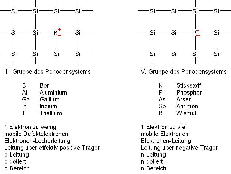 Abbildung 3 zeigt die Dotierung eines zweidimensionalen Siliziumkristallgitters. Jedes Siliziumatom besitzt vier Valenzelektronen und bindet dadurch unter Ausbildung von vier Elektronenpaaren jeweils vier Atome an sich. Eine n-Dotierung wird erreicht, indem beispielsweise ein Phosphoratom in das Siliziumgitter eingebracht wird. Das Phosphoratom verfügt über fünf Valenzelektronen, bei der Bindung bleibt also ein Elektron frei. Diese freie, nur noch durch Coulomb-Anziehung locker gebundene Elektron kann durch das Kristallgitter wandern, so daß der Kristall elektrisch leitend wird. Ein solches, ein Elektron abgebendes Atom wird auch als Donatoratom bezeichnet. Ein p-Gebiet wird dagegen dadurch erzeugt, daß ein sogenanntes Akzeptoratom ins Gitter eingebracht wird. In Abbildung 3 handelt es sich um ein Boratom mit nur drei Valenzelektronen.
