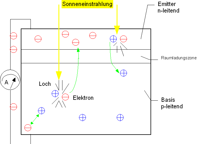 Auf ihrem Diffusionsweg zur Raumladungszone im p-Gebiet können die Elektronen leicht mit der großen Zahl der dort vorhandenen Löcher rekombinieren. Als Folge dieser Rekombination geben die Elektronen ihre Überschußenergie, die sie bei der Absorption des Photons gewonnen haben, als Wärme an das Gitter ab (Diffusionsverluste). Außer durch den beschriebenen Dotierungsvorgang kann ein inneres elektrisches Feld in einem Halbleiter auch durch den Kontakt des Halbleiters mit einer Metallschicht (Metall-Halbleiterkontakt, Schottky-Diode) oder aber durch einen Übergang zwischen zwei verschiedenen Halbleitern entgegengesetzter Dotierung (Hetero-Diode) erzeugt werden. Die Schottky- sowie die Hetero-Zellen weisen gegenüber normalen p-n-Zellen eine breitere spektrale Empfindlichkeit auf.