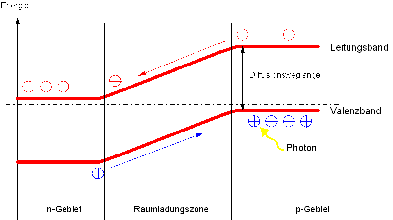 Auch im n-Gebiet kann durch Photonenabsorption ein Ladungsträgerpaar entstehen. Hier sind die Löcher in der Minorität. Reicht ihre Diffusionslänge aus, die Grenze der Feldzone zu erreichen, werden sie beschleunigt und gelangen so in das p-Gebiet. Erst durch das Vorhandensein des inneren elektrischen Felds bei einer p-n-Verbindung können die Ladungsträger bei Lichteinfall sofort getrennt werden.