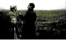 Die Innenseite, die der Mann gerade liest, hat als Schlagzeile: >Der Frieden ist schwach<. Der Mann entfernt sich. Die Kamera schwenkt mit und erfaßt im Hintergrund eine Gruppe spielender Kinder. /
